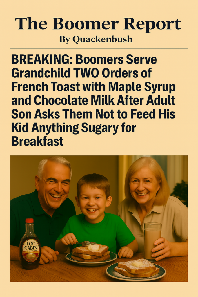 By : Quackenbush™ Tags: Boomer Babysit boomer humor Breakfast Meme Breaking Boomer Report Comedy Funny Meme Generational Humor memes Quackenbush Viral Meme